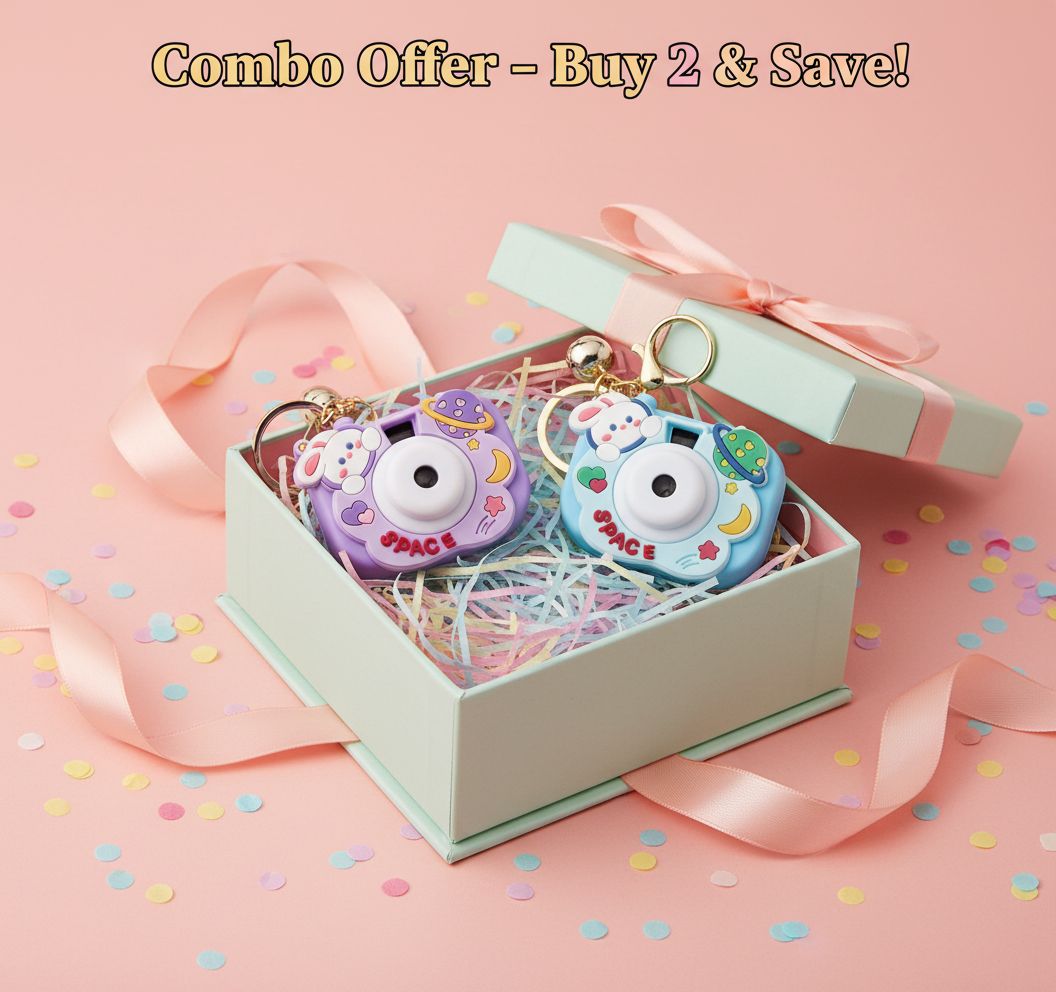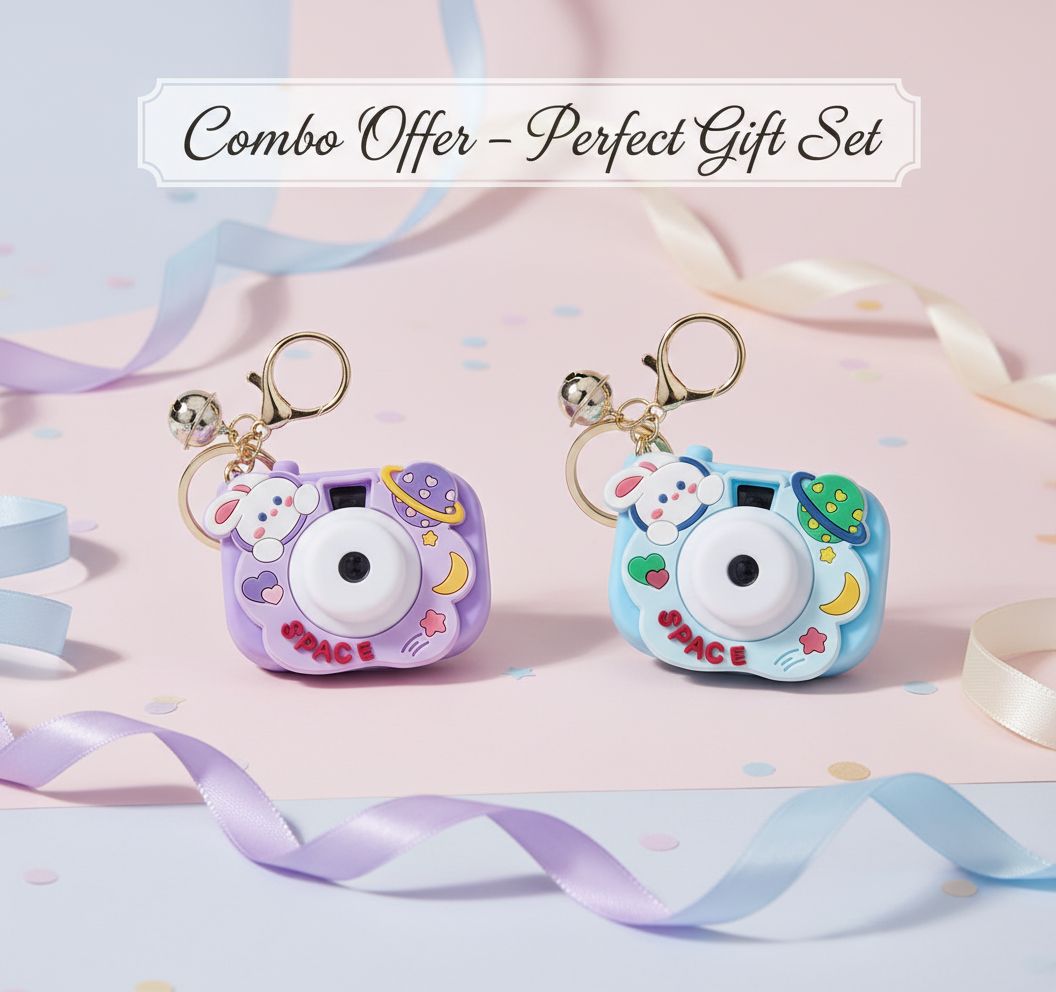 This festive combo includes two adorable mini camera keychains in cute space & bunny themes. With just one click, each camera projects fun, colorful images, turning every moment into excitement and joy.